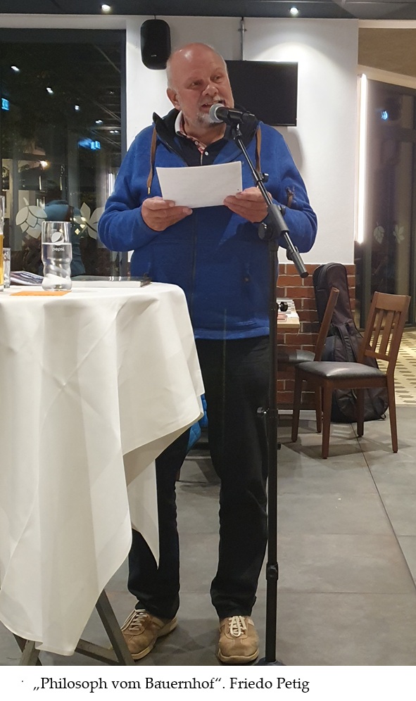 Nach dem Essen trat dann der nächste Künstler auf: Friedo Petig – auch als Philosoph vom Bauernhof bekannt – unterhielt die Teilnehmer mit humoristischen Reimen. Dabei erwies er sich als intimer Kenner des Bürgervereins. In seinen Reimen fanden sich viele lustige Hinweise auf einzelne Mitglieder oder Ereignisse des Vereins – sei es über die Qualität des Kuchenbuffets oder den gemeinsamen Geburtstag mit Elvis Presley.